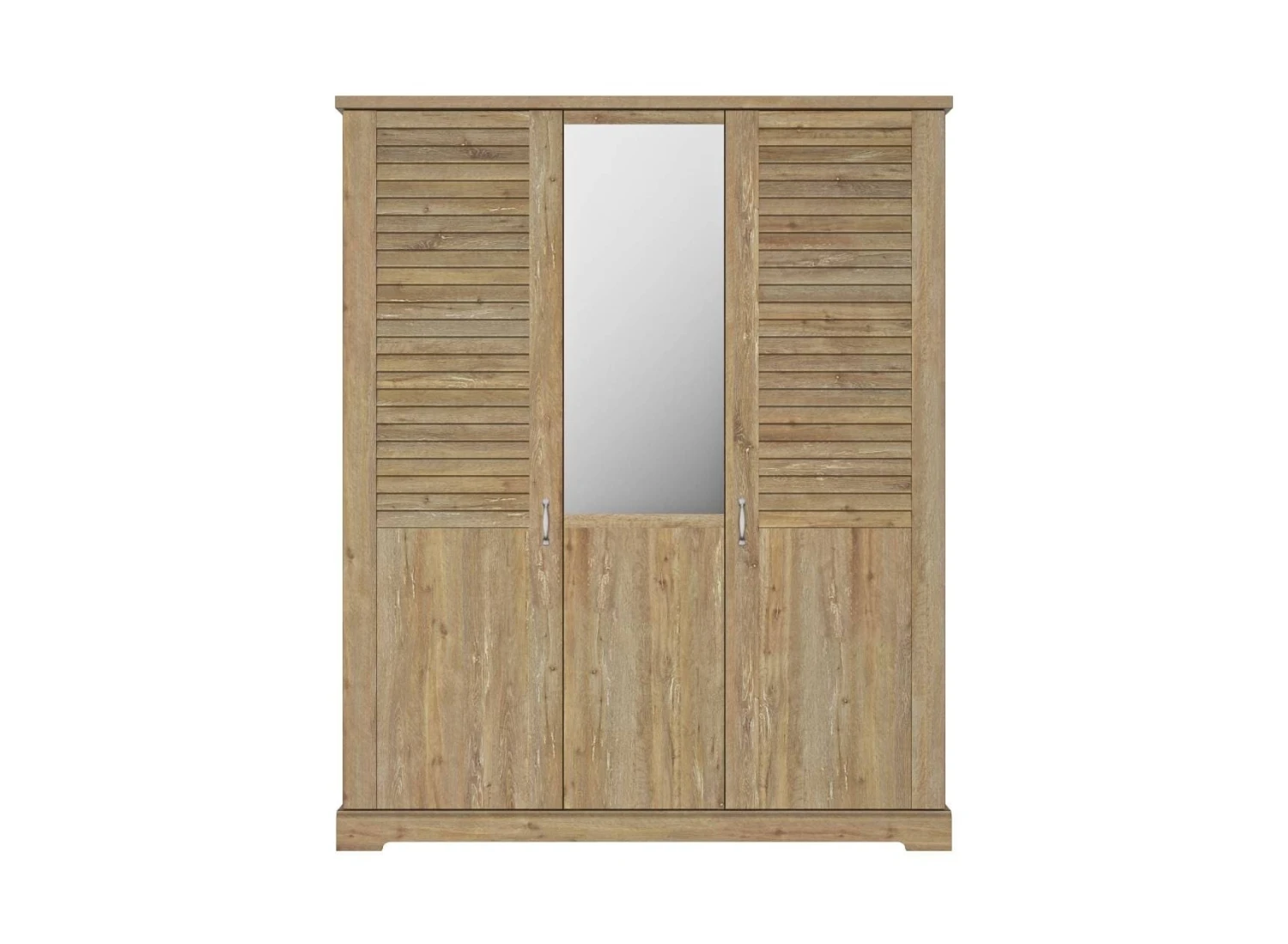 Un grand miroir est installé sur la porte centrale et les poignées sont en zamak finition métal vieilli. Le jeu de persiennes en façade de cette armoire 3 portes donnera une petite touche méditerranéenne à la chambre. Son coloris châtaignier blanchi s’assortira parfaitement à de nombreux styles de décoration sans assombrir la pièce. Qui plus est, le dessus de l’armoire est de 35mm d’épaisseur.