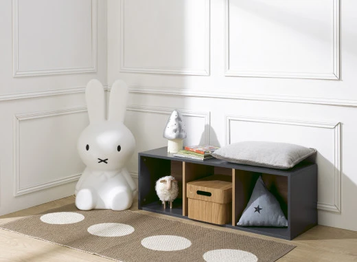 C’est un rangement pratique. En effet, ses 3 grandes cases vous offrent la possibilité de ranger de nombreuses affaires. Votre enfant pourra y placer des livres de toutes tailles, ainsi que des jouets divers et variés. En effet, les cases mesurent toutes 32 x 32 x 32 cm.