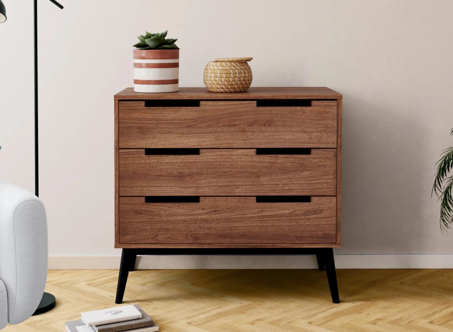 Ce modèle est aussi une parfaite commode pour la chambre des parents. Le coloris Noyer vintage de notre commode 3 tiroirs s’associe très facilement à de nombreuses ambiances décoratives.