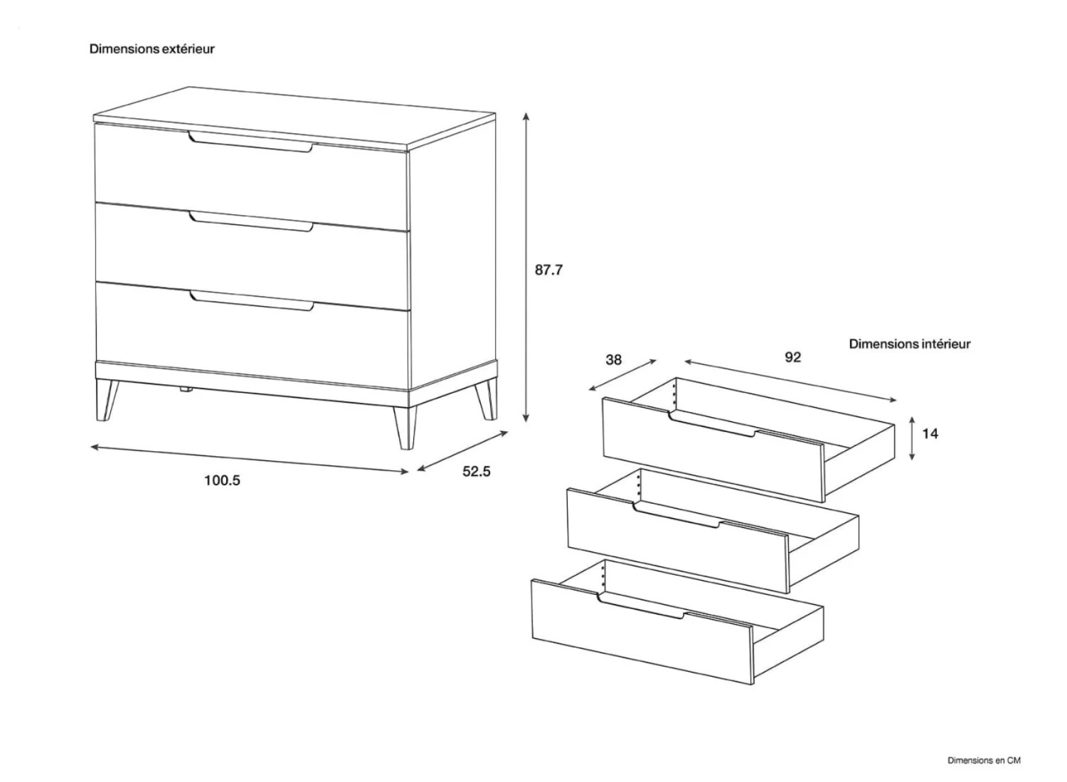 3 grands tiroirs, c’est 3 fois plus de place pour ranger les affaires de votre enfant dans cette grande commode 3 tiroirs de 100,5cm de long sur 52,5cm de large.