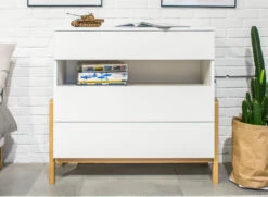 - Une commode 3 tiroirs: cette commode bébé possède 3 tiroirs pour un rangement optimisé, mais également une étagère au milieu qui vous permettra d’utiliser des panières ou d’exposer des accessoires. Cette commode peut être associée à une table à langer ou un plan à langer amovible pour vous permettre de changer votre bébé.