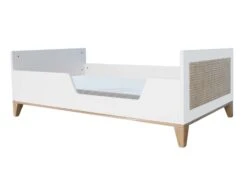 Avec la chambre bébé en bois NAMI, vous optez pour deux jolies créations de meubles qui allient le bois peint en blanc à des éléments en cannage rotin, des matières tendances et naturelles ! Cette chambre bébé mixte se compose d’un lit bébé évolutif. Ce lit à barreaux va en effet pouvoir être transformé en lit enfant lorsque l’enfant sera en âge de dormir dans un lit de grand. Il pourra être utilisé jusqu’à l’âge de 6 ans environ. Il ne vous manquera plus qu’un matelas bébé 70×140 cm. Nous vous proposons une sélection de modèles en coton bio et en bambou.