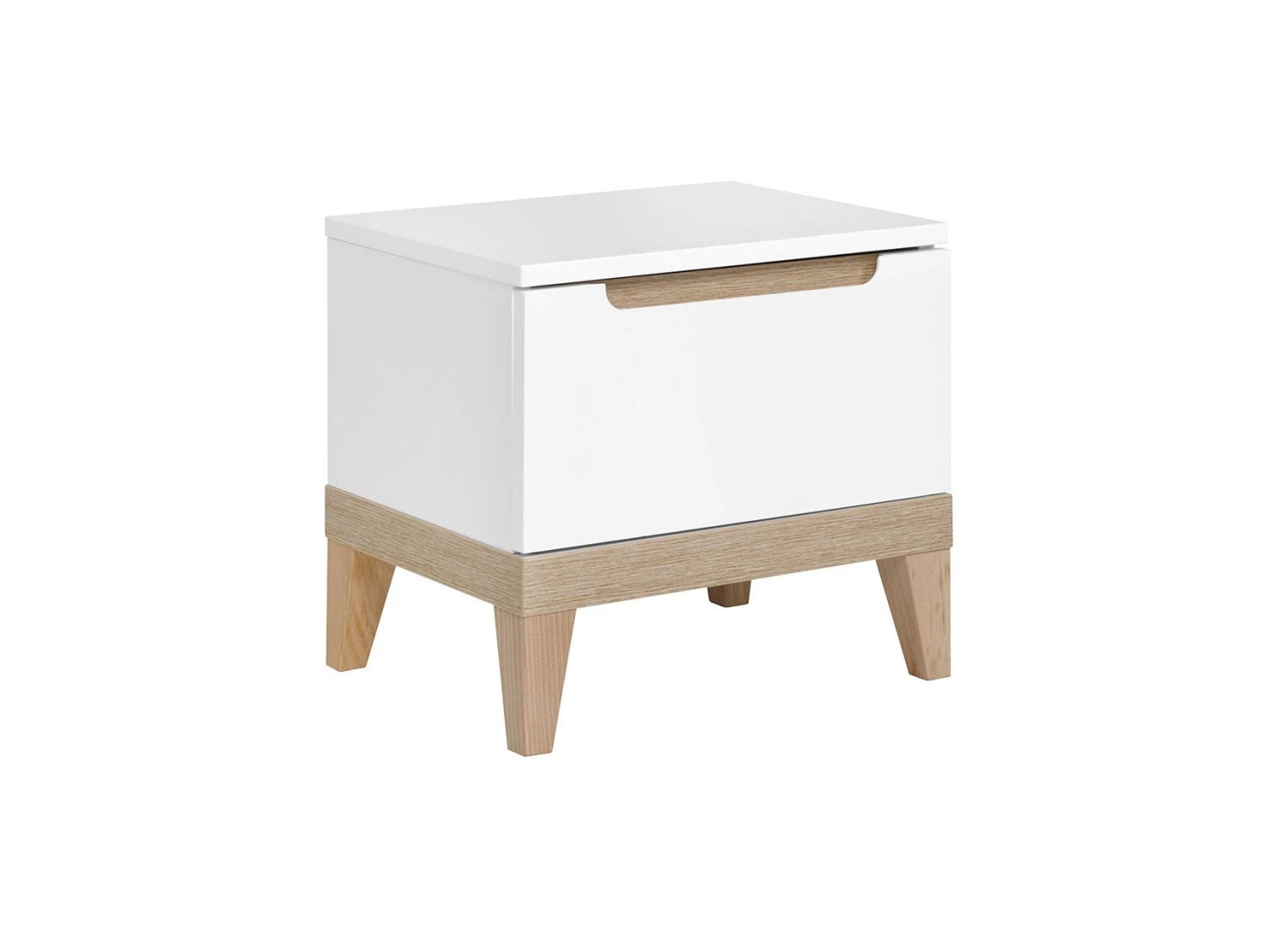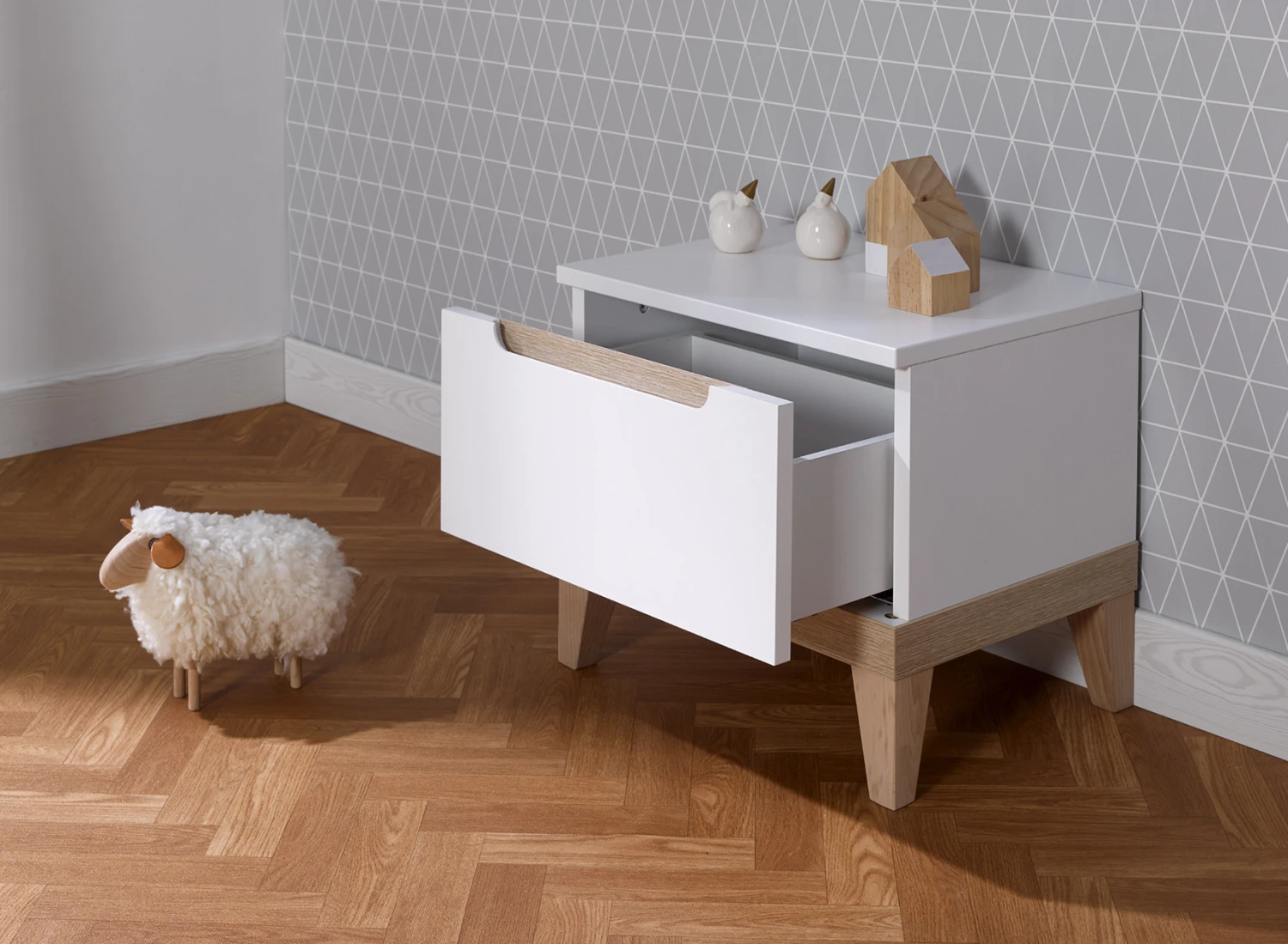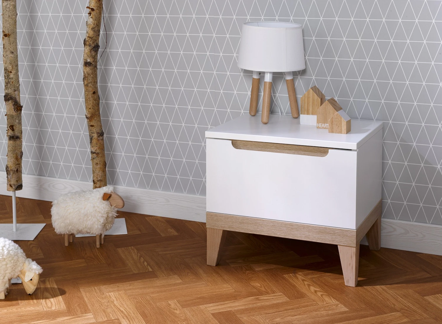 Ce chevet est un meuble intemporel. Mariage entre un piètement en bois de chêne et une structure blanche, il trouvera sa place dans toutes les chambres enfant. Son design scandinave en fait un chevet original qui plaira à toutes et à tous.