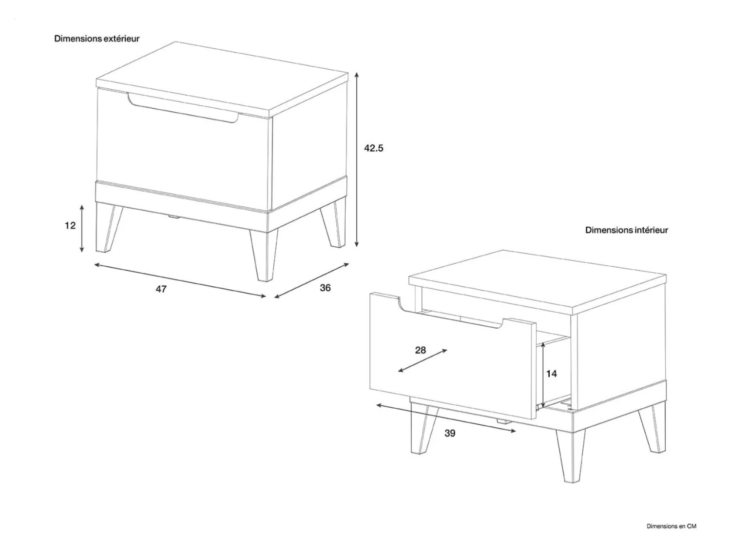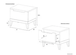 Les dimensions de la table de chevet en bois VOLT sont : 47 cm de long, 36 cm de large et 42,5 cm de haut.