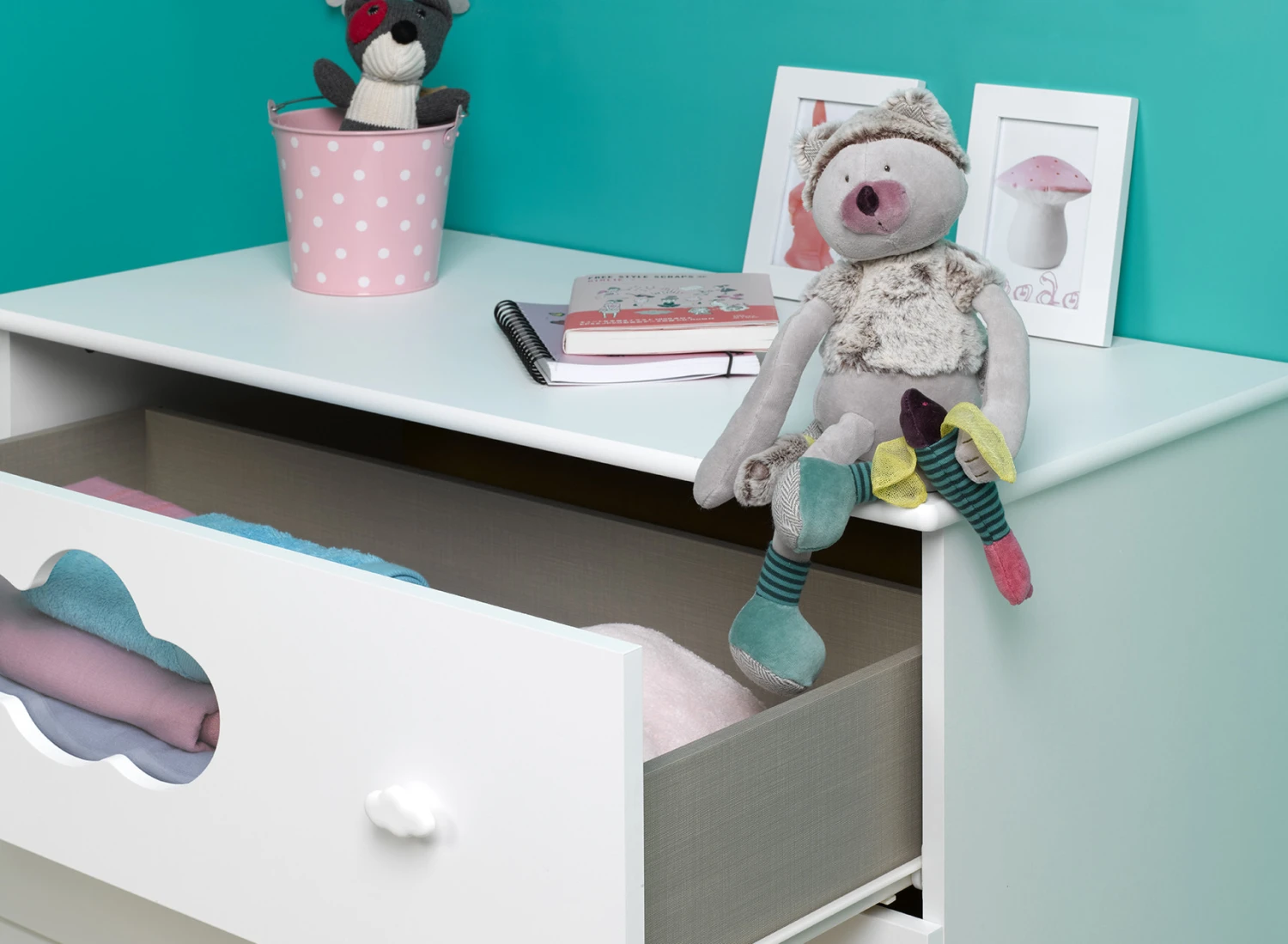 Avec ce meuble bébé, même les poignées sont stylées : des petits nuages en guise de poignées d’ouverture des tiroirs.