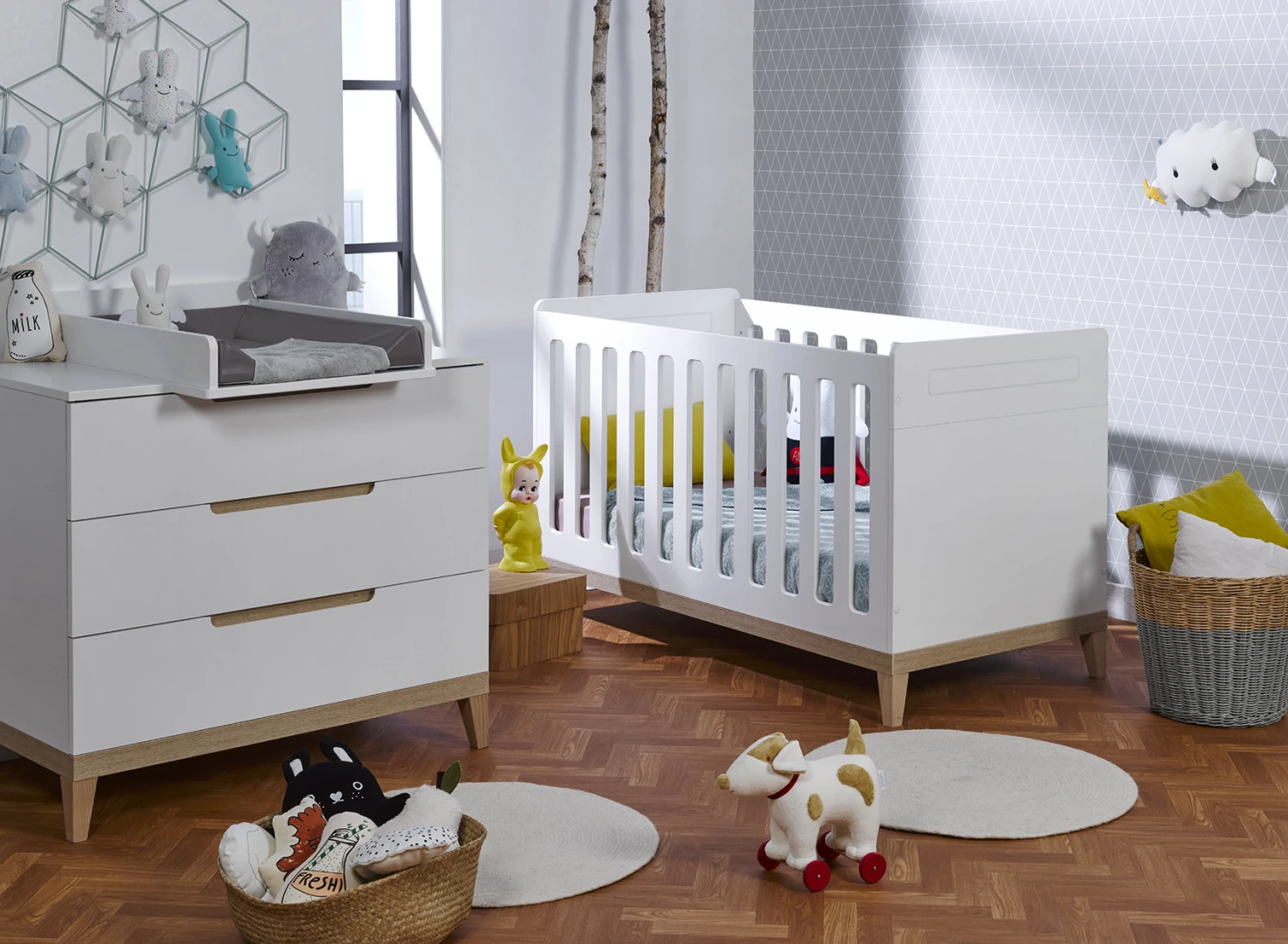 Courbes épurées, géométriques et graphiques, ce lit bébé original en bois est la pièce maitresse de cette collection moderne, design et une pointe rétro.