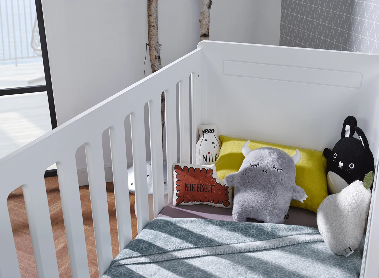 - Un sommier 70×140 cm est fourni, réglable sur trois hauteurs pour s’adapter aux besoin du bébé ainsi que deux pans de lit fournis pour la transformation du lit.