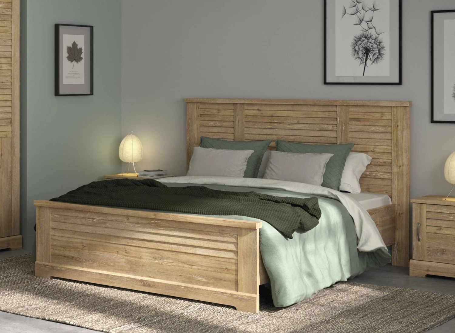 Le lit double en bois massif BALYSS est inspiré du style méditerranéen. Nous avons donc opté pour des façades avec un jeu de persiennes afin de retrouver le charme de ce type de meubles. Avec son coloris châtaignier blanchi, il offre la possibilité de profiter d’un joli meuble couleur bois sans assombrir la pièce.