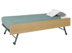 Qui plus est, ce lit gigogne 90×190 dispose Ă©galement d’un second couchage. CachĂ© sous le lit du haut, ce second lit est escamotable, ce qui permet de l’installer Ă hauteur confortable et d’en faire bien plus qu’un lit d’appoint. Deux enfants qui partagent une petite chambre apprĂ©cieront ce lit gigogne avec rangement pour gagner de place, mais aussi passer des nuits confortables.