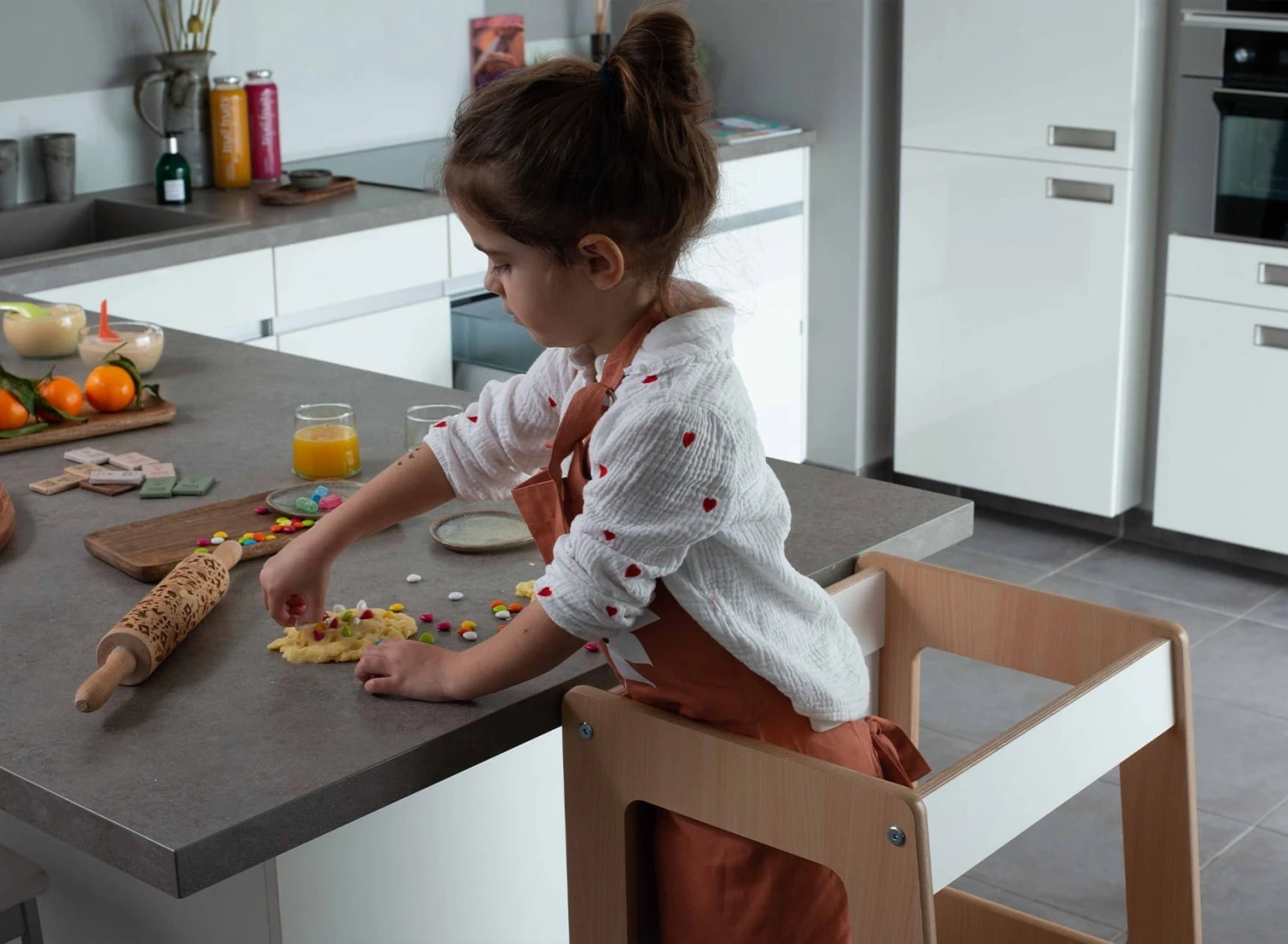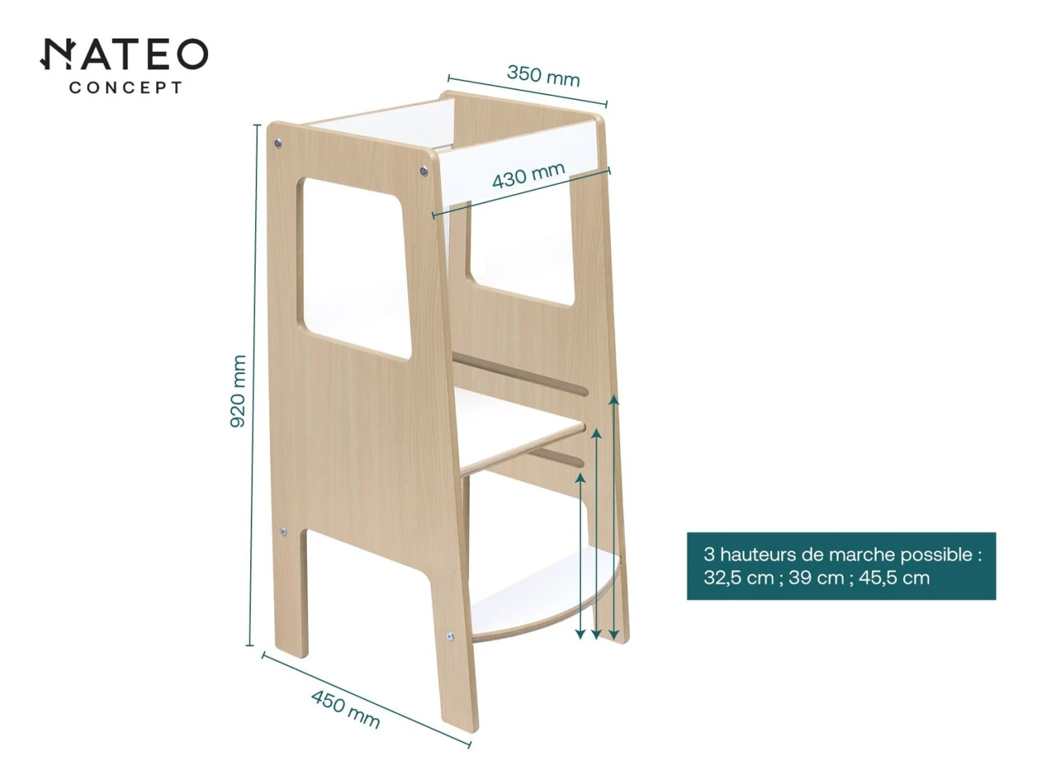 La tour d’apprentissage Nateo est ajustable sur 3 hauteurs, ainsi, elle accompagnera votre enfant jusqu’Ă l’âge environ 6 ans.