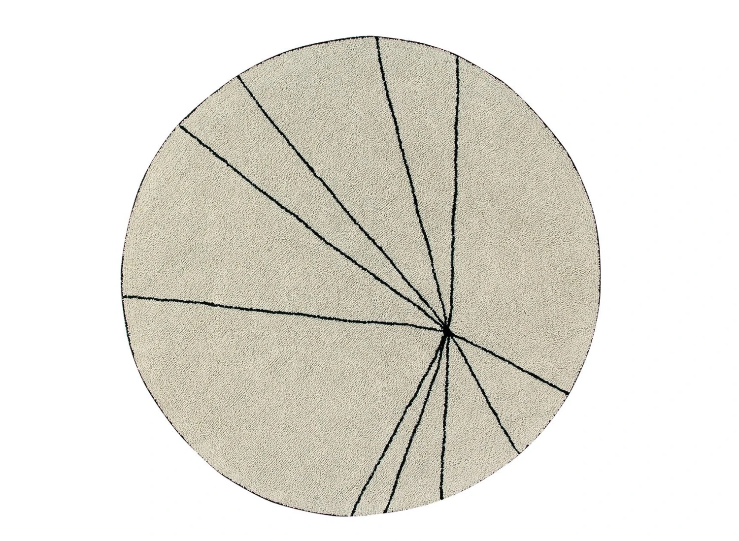 De forme ronde, il intègre des lignes noires simples qui partent du même point et créent des motifs géométriques de différentes tailles. Ce tapis a été réalisé selon une technique de tissage appelé « boucles », pour plus de confort et de chaleur.
